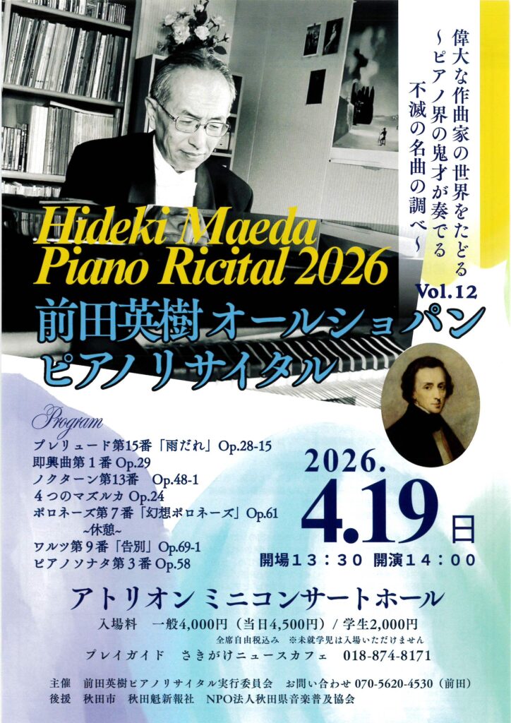 4月19日秋田市のアトリオンで「前田英樹オールショパンピアノリサイタル」開催!