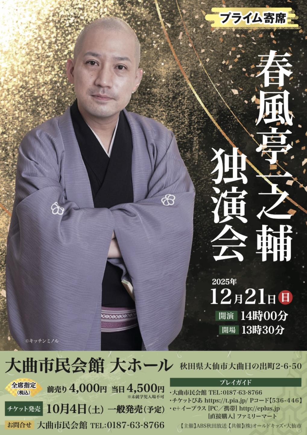 大仙市の大曲市民会館で12月21日「春風亭一之輔 独演会」が開催されます。