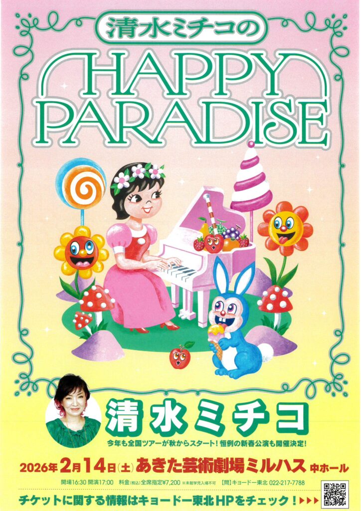2026年2月14日に秋田市のあきた芸術劇場ミルハスで「清水ミチコのHAPPY PARADISE」開催!