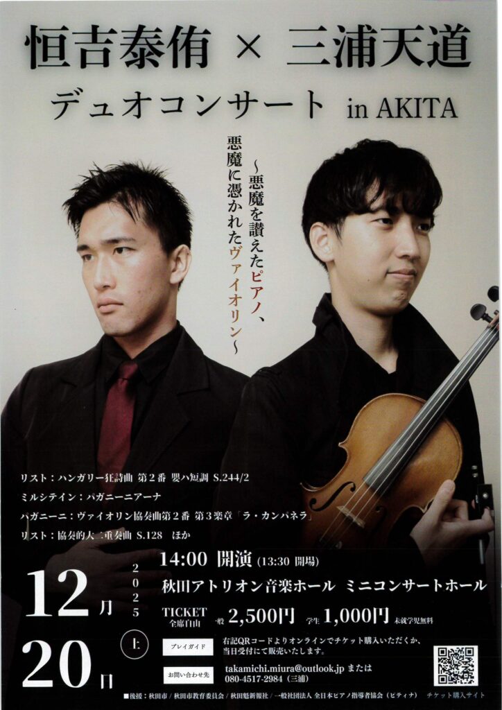 12月20日秋田市アトリオンで「恒吉奏侑×三浦天道デュオコンサート」開催! -