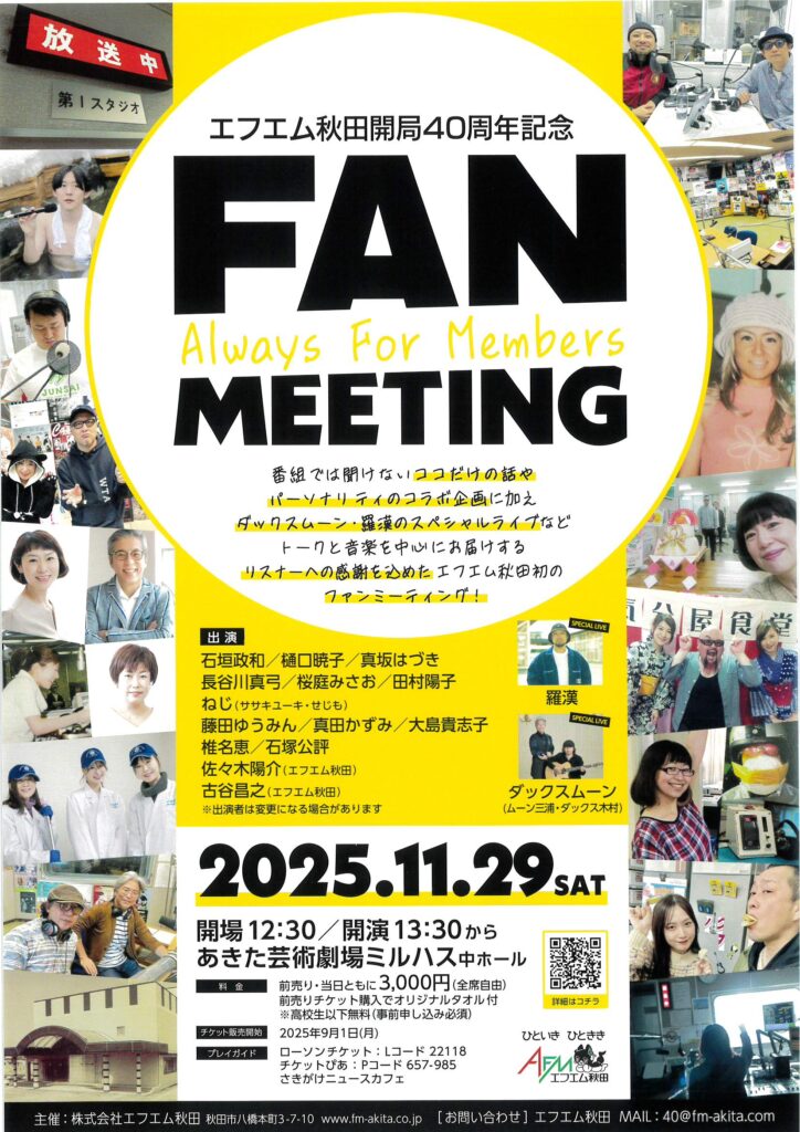 11月29日秋田市のあきた芸術劇場ミルハスでエフエム秋田開局40周年記念「FAN MEETING」開催!