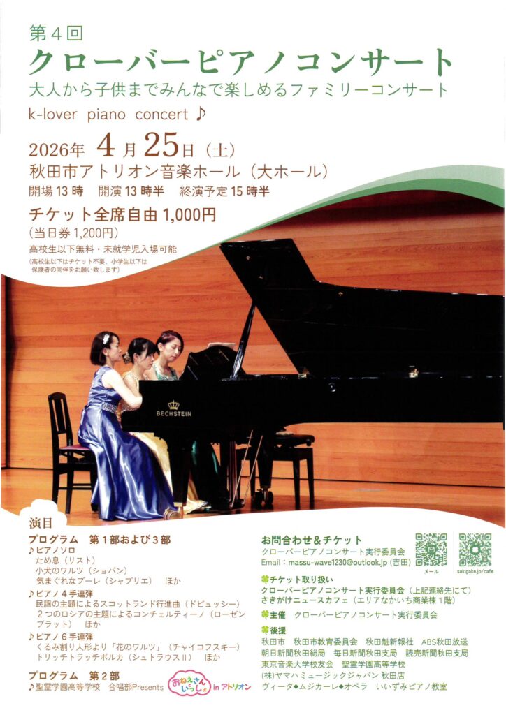 2026年4月25日秋田市アトリオンで「クローバーピアノコンサート」開催!