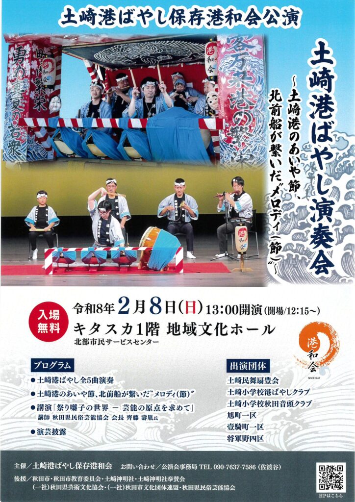 2026年2月8日秋田市北部市民サービスセンターで「土崎港ばやし演奏会」開催!