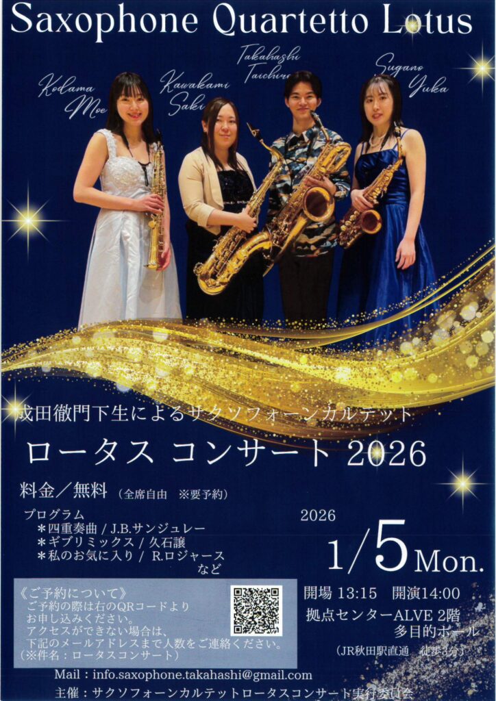 2026年1月5日(月)秋田市の秋田拠点センターアルヴェ で成田徹門下生によるサクソフォーンカルテット「ロータスコンサート」開催!