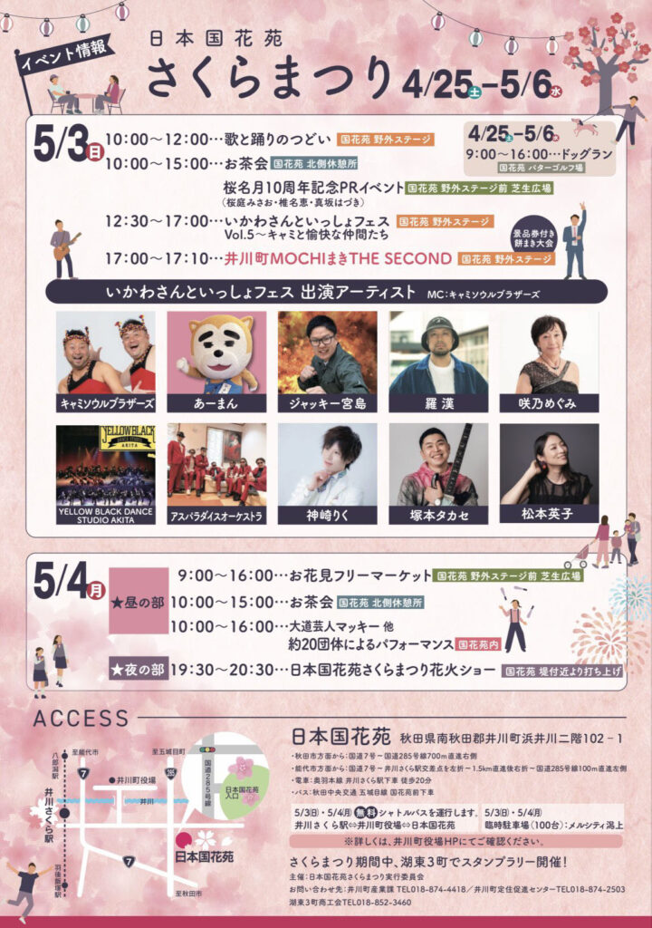 2026年4月25日~5月6日秋田県井川町の日本国花苑で「さくらまつり」開催!