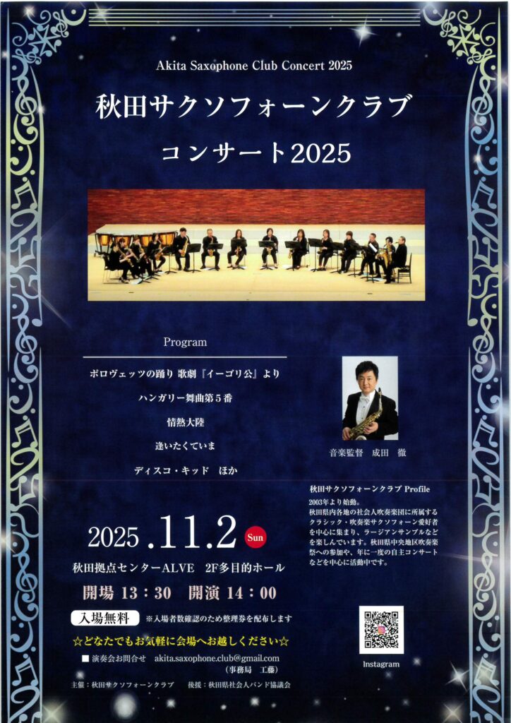 11月2日(日)秋田市の秋田拠点センターアルヴェ で「秋田サクソフォーンクラブコンサート」開催!