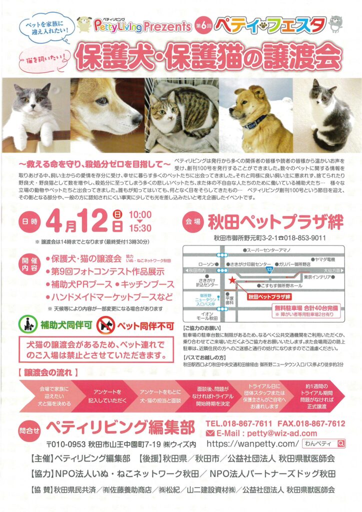 4月12日に秋田市の秋田ペットプラザ絆で第6回ぺティ・フェスタ「保護犬・保護猫の譲渡会」開催!