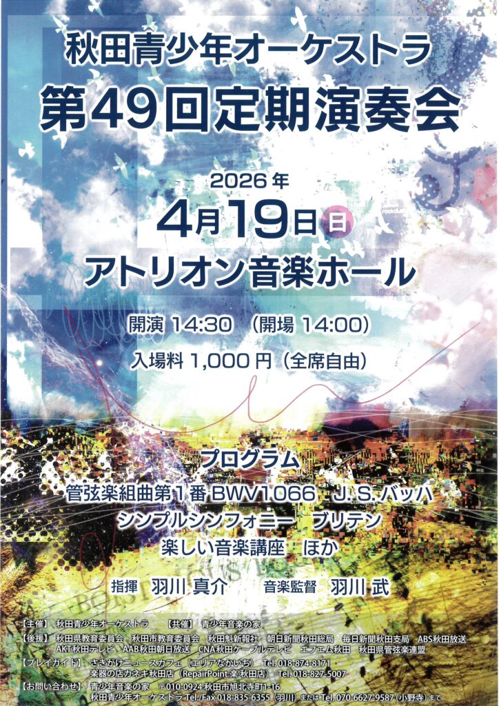 2026年4月19日秋田市のアトリオンで「秋田青少年オーケストラ定期演奏会」開催!